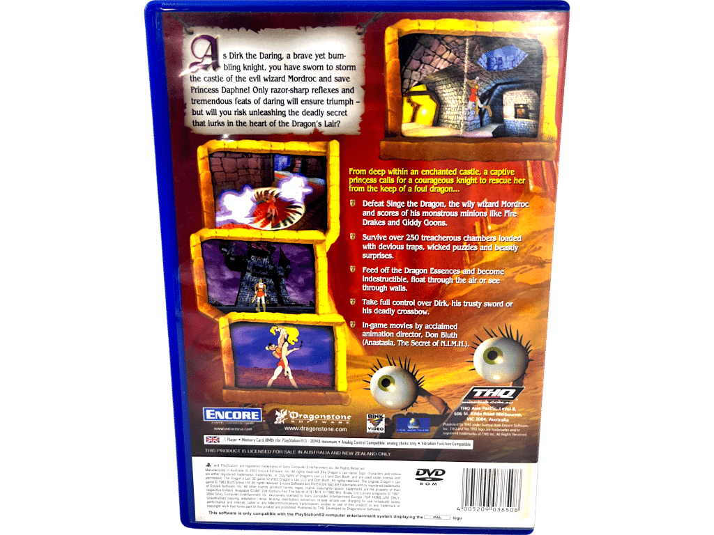 Good condition & 100% complete with contents: Dragon’s Lair 3D Special Edition for SONY PlayStation 2 / PS2. This preowned game comes complete with case + cover + manual / booklet + game disc. Some light superficial markings / cosmetic scratches, but these are very minor imperfections which do not affect game play in any way.