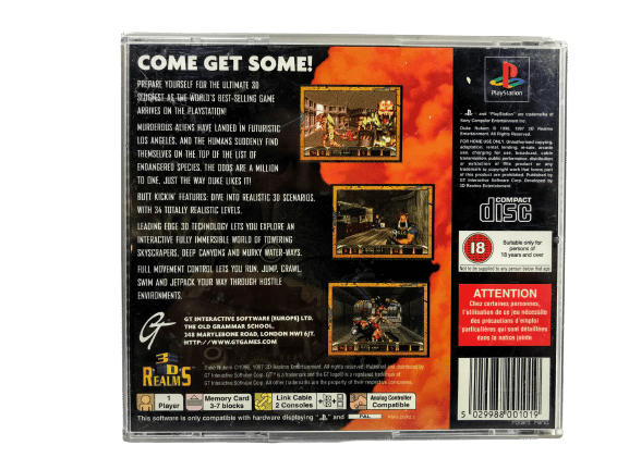 The Original Print in excellent condition & 100% complete with booklet: DUKE NUKEM The Original Game for SONY PlayStation / PS1. This preowned game is a very tidy collector’s item, and comes complete with case, cover, manual / booklet, and game disc. The only imperfections I could find were one of the small plastic hinges on the front plastic panel is damaged, and (barely worth mentioning as not noticeable unless up close and looking for them): some faint superficial disc scratches. This is a very tidy example, and a suitable collector’s item.