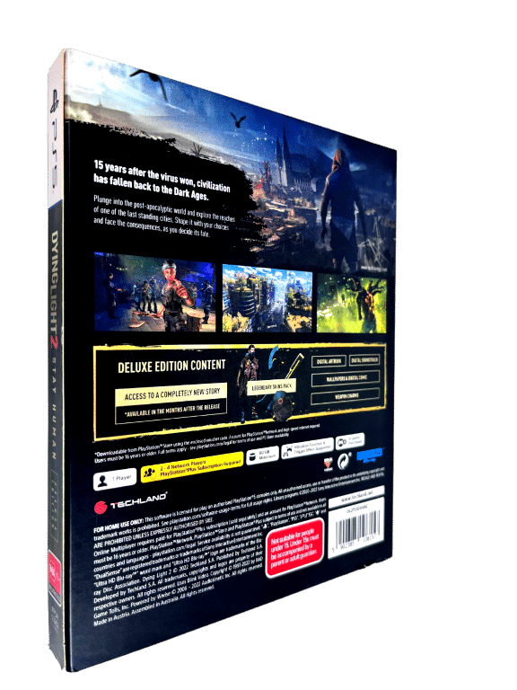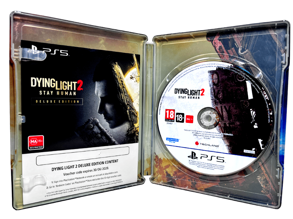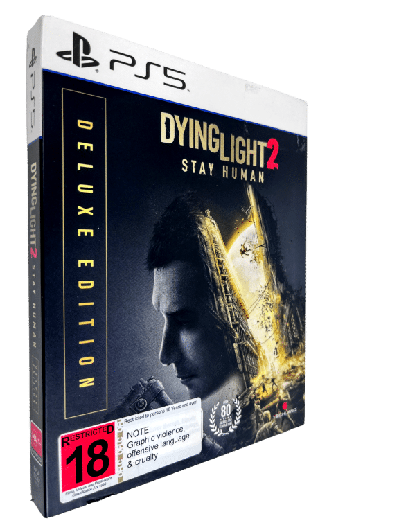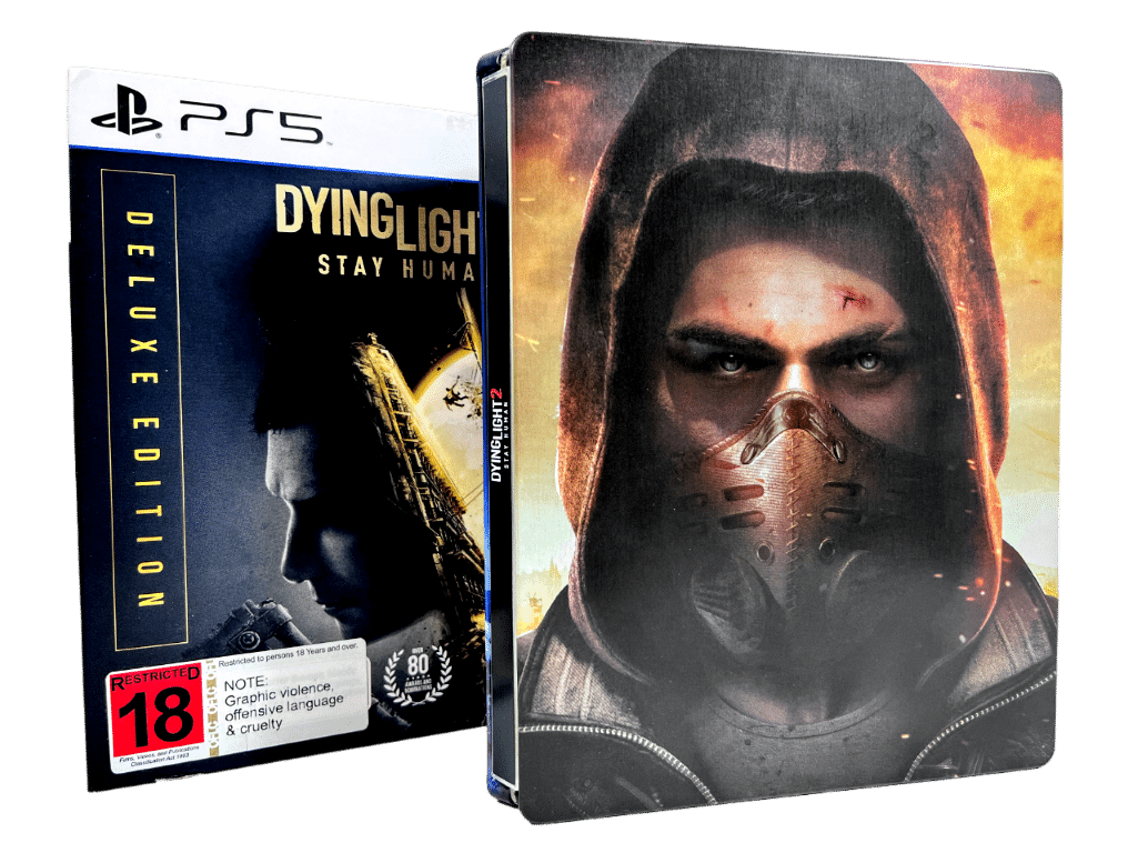 Dying Light 2 Stay Human STEEL CASE COLLECTOR’S DELUXE EDITION. This DYING LIGHT 2: Stay Human Deluxe Edition (STEEL CASE COLLECTOR’S Ed.) for SONY PlayStation 5 / PS5 is preowned, but in Excellent Condition, with Official Collector’s Display Box + Steelbook (Steel Collector’s Case), carded insert, and game disc. Please note that any single use Deluxe Edition special bonus content vouchers will have expired. The game disc includes the Full Dying Light 2 Stay Human PS5 game on the disc.