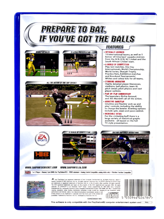 Cricket has taken the leap onto the next generation console, the Sony PlayStation2, and proves itself to be the definitive Cricket game of all time! Crickets evolution to the PlayStation 2 has meant an incredible leap in just about all areas of the product. Detail in stadiums, players, player faces, ball physics, team AI, pitch details, pitch physics and player options have all seen majore improvements.