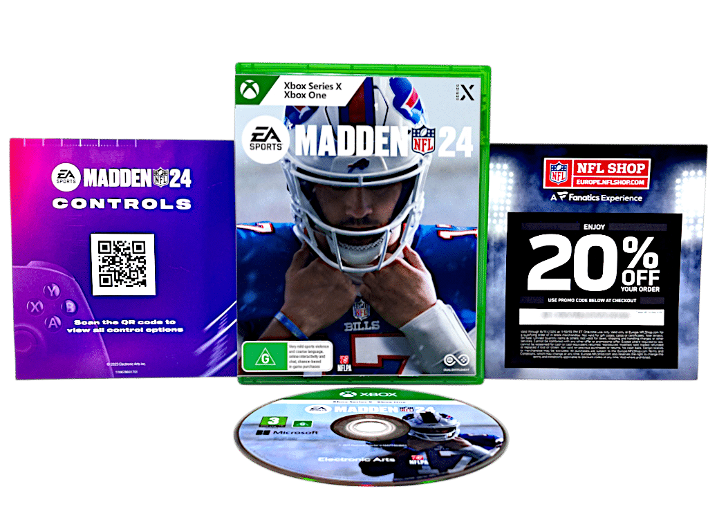 EA Sports MADDEN NFL 24 (MADDEN 24) for XBox One and XBox Series X. This preowned game is in excellent condition and comes complete with case + cover + carded insert + game disc. Case is an official Xbox One Case.