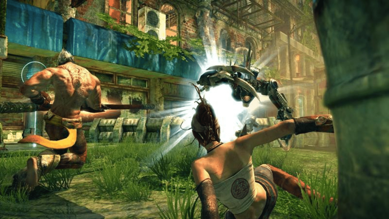 More than 150 years in the future, the world has transformed into an unrecognizable state where all that remains are a dwindling human population and merciless robots left over from wars long past. In Enslaved, players take on the role of Monkey, a strong and brutish loner, and his AI partner Trip, a technologically savvy but sheltered young woman from a peaceful community. Both become captured by a mysterious slave ship, which are rumored to harvest people and take them out west never to return. As they each attempt to escape, Trip realizes quickly that Monkey, with his raw strength and power, is the only hope she has of making the perilous journey back home. She hacks into a slave headband to enslave Monkey and link them together – if she dies, he dies. Her journey has now become his.