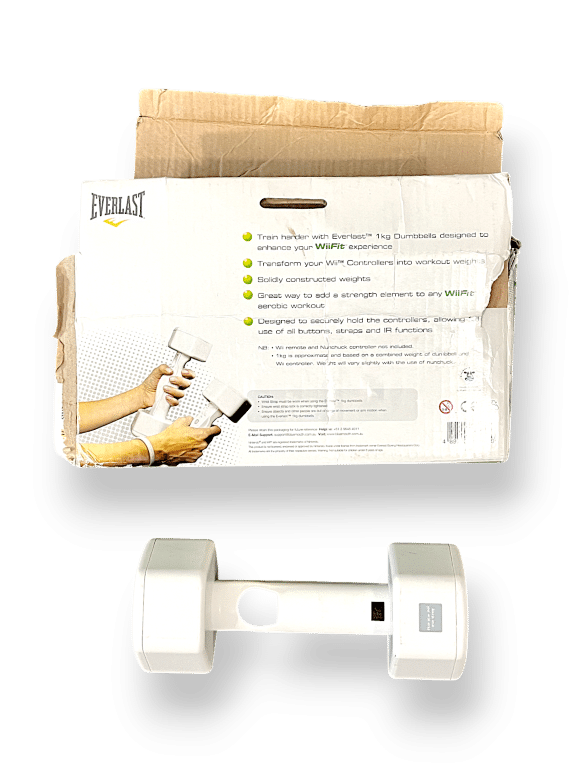 Everlast Dumbbell x 1 for Wii Fit (Nintendo Wii) with original box. This preowned dumbell is in great condition and includes its original box which has come apart at the seams, but is still included. One dumbbell only (the s second dumbell is not included).
