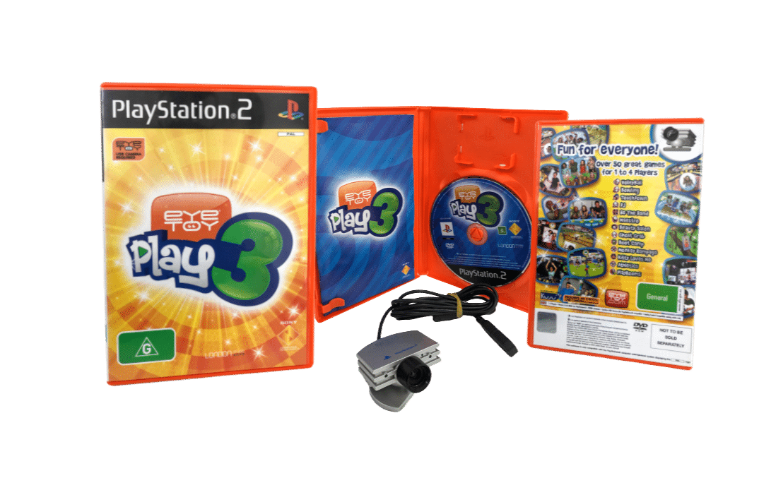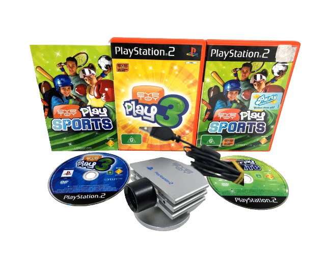 Official PlayStation 2 Eye Toy Camera / EyeToy Camera + EyeToy Play 3 + EyeToy Play Sports games. This preowned camera + games bundle is in good condition and perfect working order. Note that the third game, Spy Toy, For SONY PlayStation 2 / PS2.