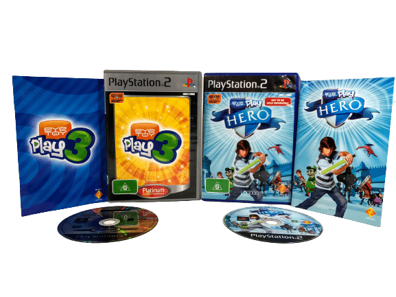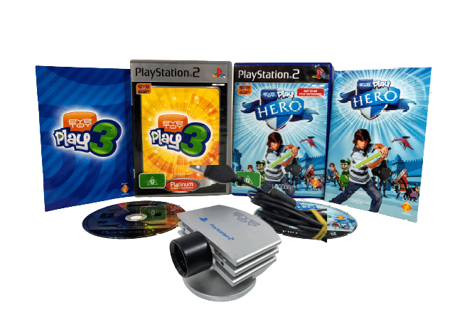 Official PlayStation 2 Eye Toy Camera / EyeToy Camera + EyeToy Play HERO + EyeToy Play 3 PS2 games. This preowned camera + games bundle is in excellent condition and perfect working order. Silver Edition. For SONY PlayStation 2 / PS2. Games come complete with covers, manuals / booklets, and game discs each in excellent condition. Game cases have some minor plastic wear (tiny plastic chip missing from top of Eyetoy Play Sports case), but nothing that inhibits their functionality, and the contents inside are superb.