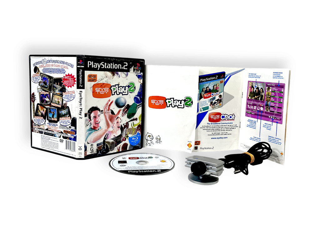 EyeToy: Play 2 expands the original hit motion-controlled experience with even more interactive games and activities — bundled here with the sleek silver EyeToy USB camera. Players use their real-life movements to play directly on screen, waving, jumping, and dodging through an array of fun mini-games that test reflexes, coordination, and creativity. From sports challenges like table tennis and boxing to quirky party games involving cleaning windows or herding animals, the game is designed for energetic family fun and easy pick-up play. The included EyeToy camera tracks your motions in real time, making every session a lively, laughter-filled experience.