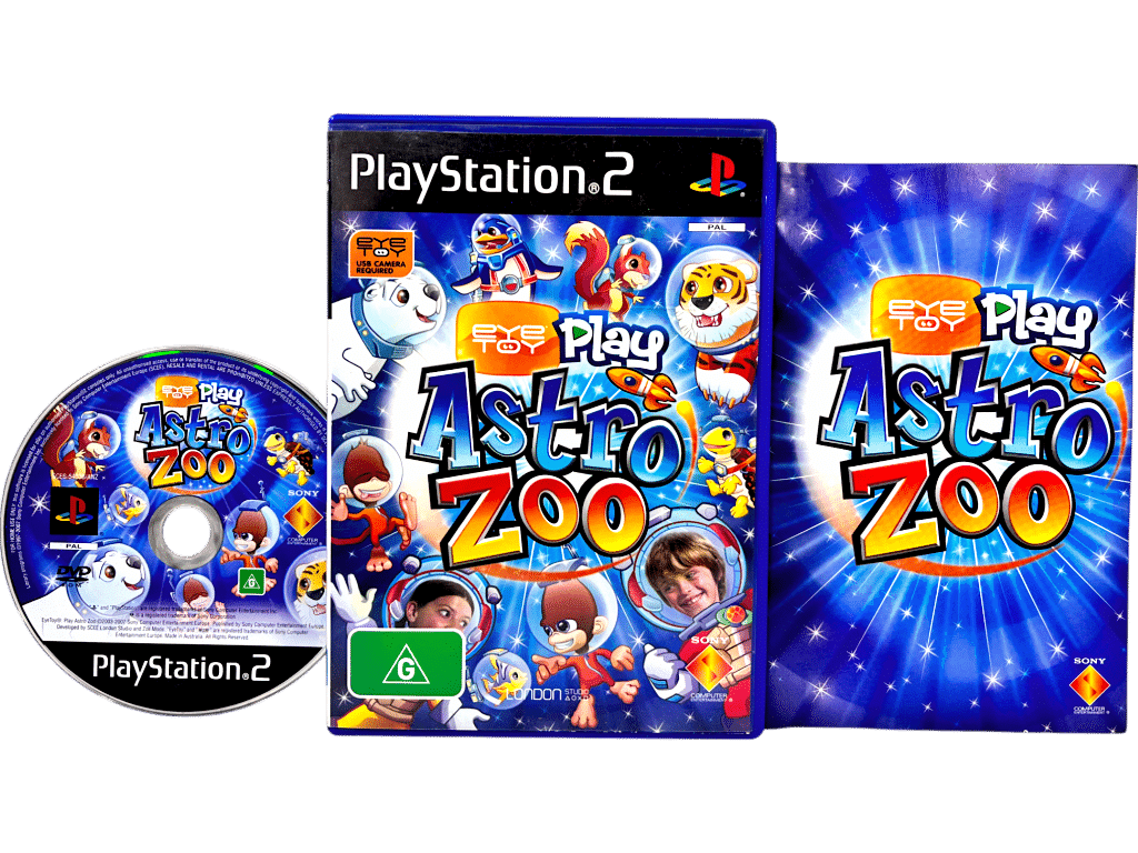 EyeToy: Play Astro Zoo is a PS2 game developed by Zoë Mode and released exclusively for Europe and Australia in late 2007. The game play revolves around use of the Eyetoy camera in a series of minigames with the end goal of herding scattered zoo animals back into their respective zones.