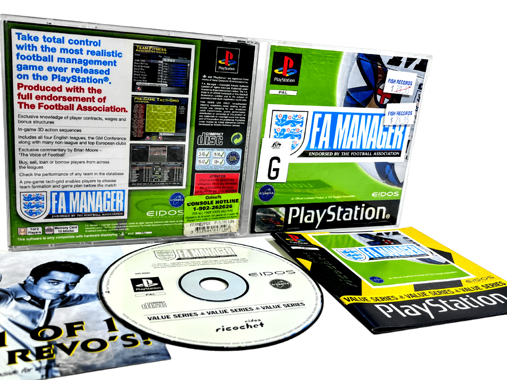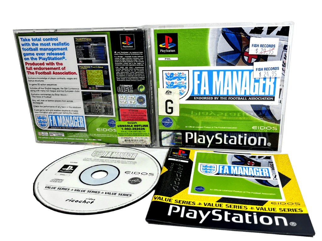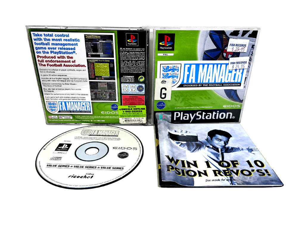 Rare Find: MINT condition & 100% complete with contents: FA MANAGER / FOOTBALL ASSOCIATION MANAGER for SONY PlayStation / PS1. This preowned game is in pristine condition and comes complete with covers (both front and rear covers) + manual / booklet + game disc. A very tidy and complete collector’s item.