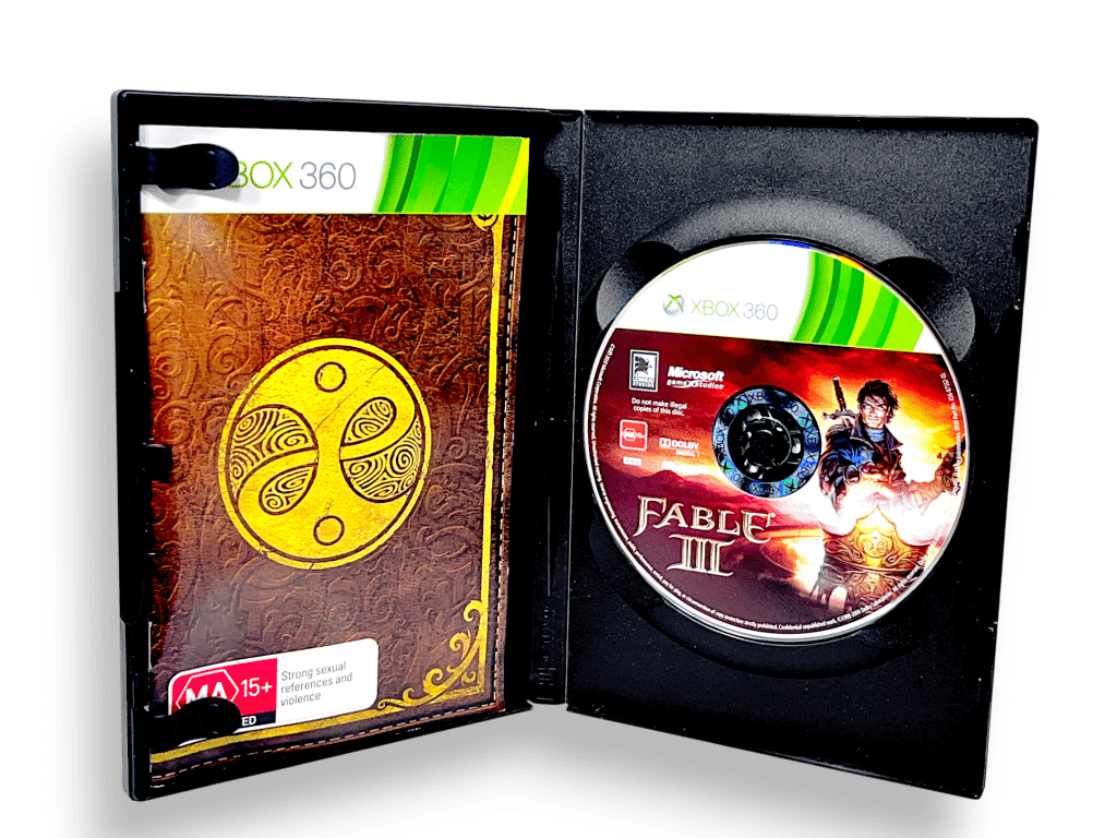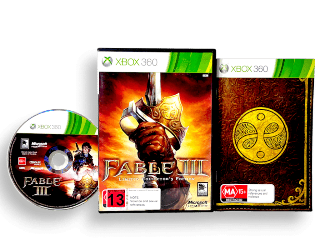 Genuine Limited Edition BLACK CASE EDITION (Authentic Microsoft Xbox 360 Limited Black Case included!) in mint condition & complete with manual: Fable 3 / FABLE III LIMITED EDITION for XBox 360 (and game also plays on Xbox One). This preowned game is in pristine condition comes complete with Genuine Xbox 360 Black case + limited collector’s edition cover + manual / booklet + game disc. The voucher cards are not included, but these were promotional downloads only and are not required for gameplay or completion. The full Fable 3 game is included on the game disc, without any additional bonus voucher content.