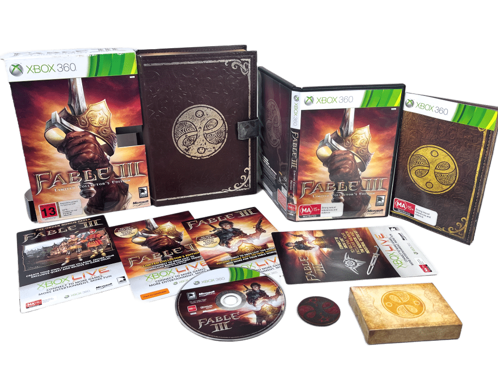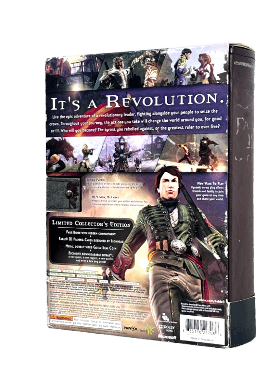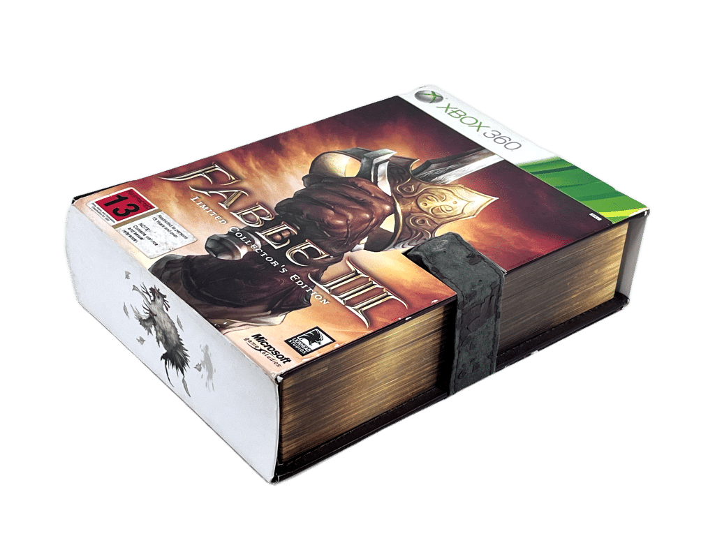Similar games each sold separately: Fable II CE, Skyrim Legendary Edition, Dragon Age Origins CE, Witcher 2 Dark Edition, Mass Effect 3 CEThis premium Collector’s Edition includes a book-style case, exclusive cards, unique in-game items, and themed packaging. Fable III blends action, RPG progression, and a moral-choice system as players rise from revolutionary hero to ruler. A must-have for collectors and fans of the Fable series, offering both display value and rich fantasy gameplay.