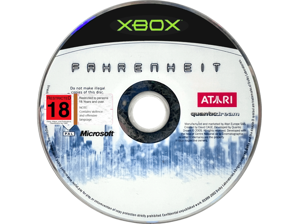 WARNING: GRAPHIC VIOLENCE. RESTRICTED 18 (R18) GAME: Fahrenheit (Xbox) Farenheight. This preowned game disc is in good condition with mild surface imperfections only. Disc comes inside an empty blank case. Please note that the original case is NOT included.