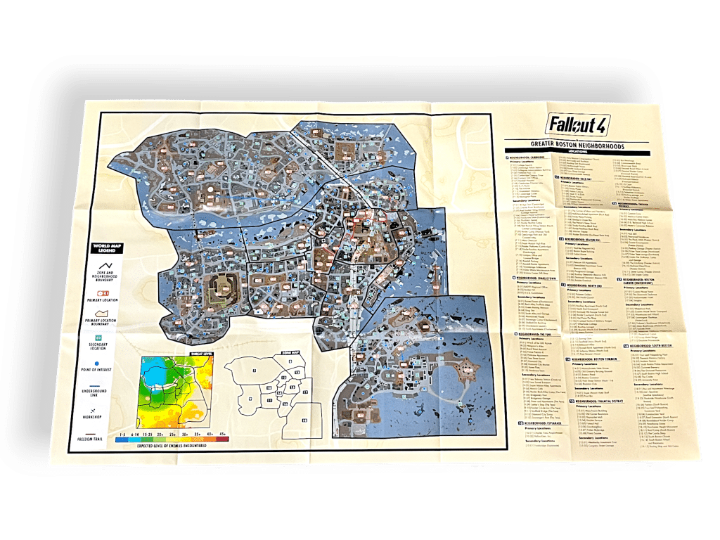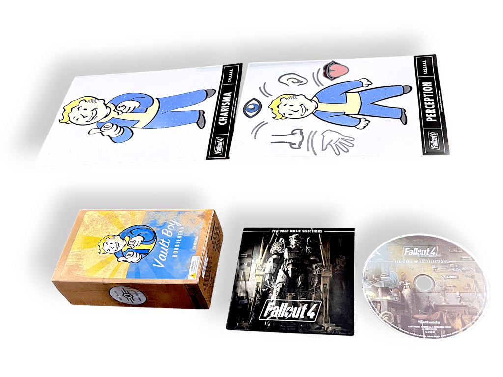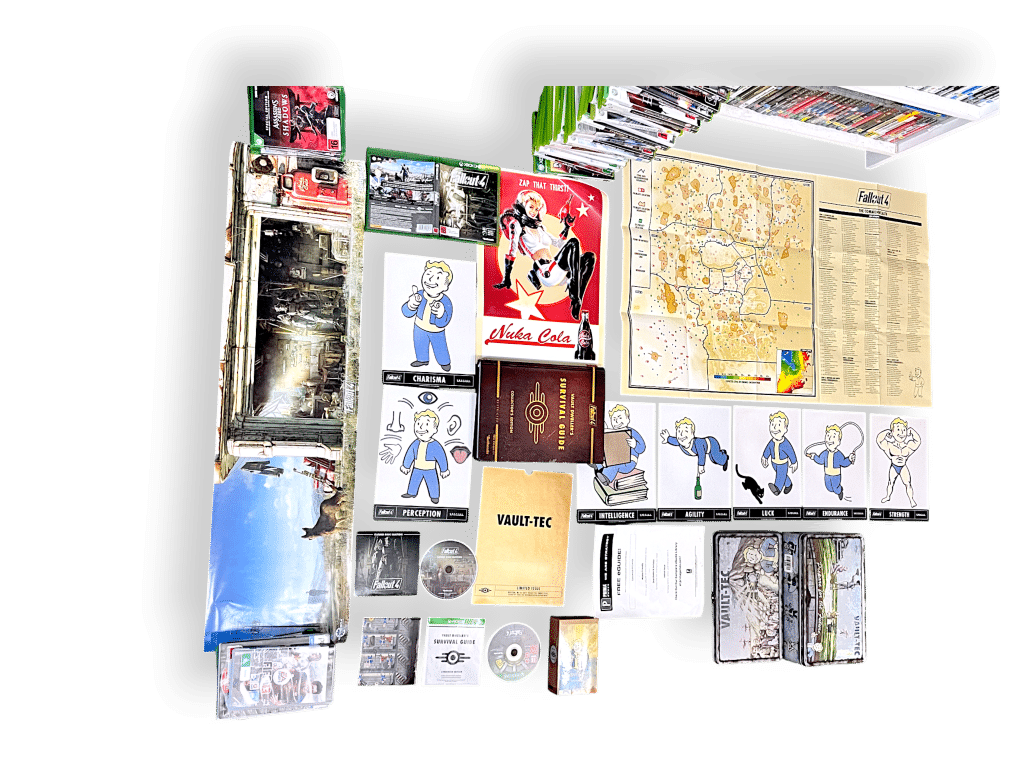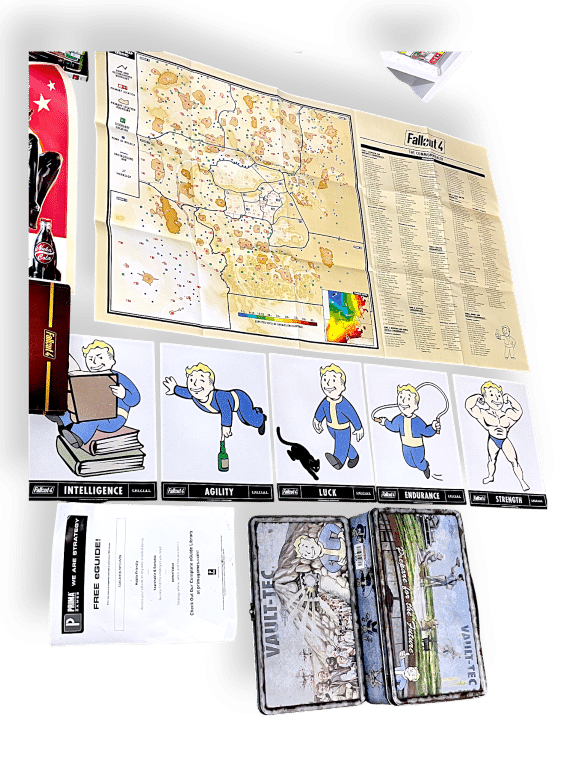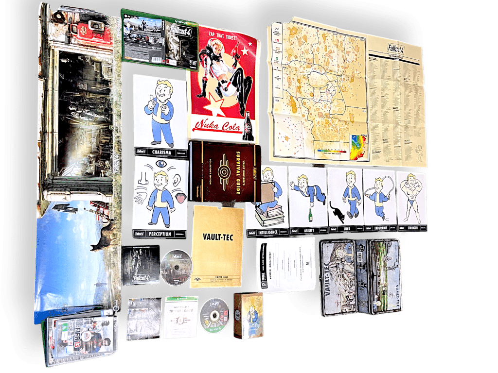 This Fallout 4 collector’s set includes a rich assortment of themed merchandise and printed materials. Highlights include a detailed map of the game world, Vault Boy posters representing character stats, a Vault-Tec survival guide, and a Nuka Cola promotional print. The set also features game discs, a Pip-Boy Pocket Guide, and a metal lunchbox-style container. A panoramic poster depicts a post-apocalyptic scene with a dog companion. Designed for fans of the franchise, this set celebrates the lore and visual identity of Fallout 4, making it a prized addition for collectors and enthusiasts of immersive RPG worlds.
