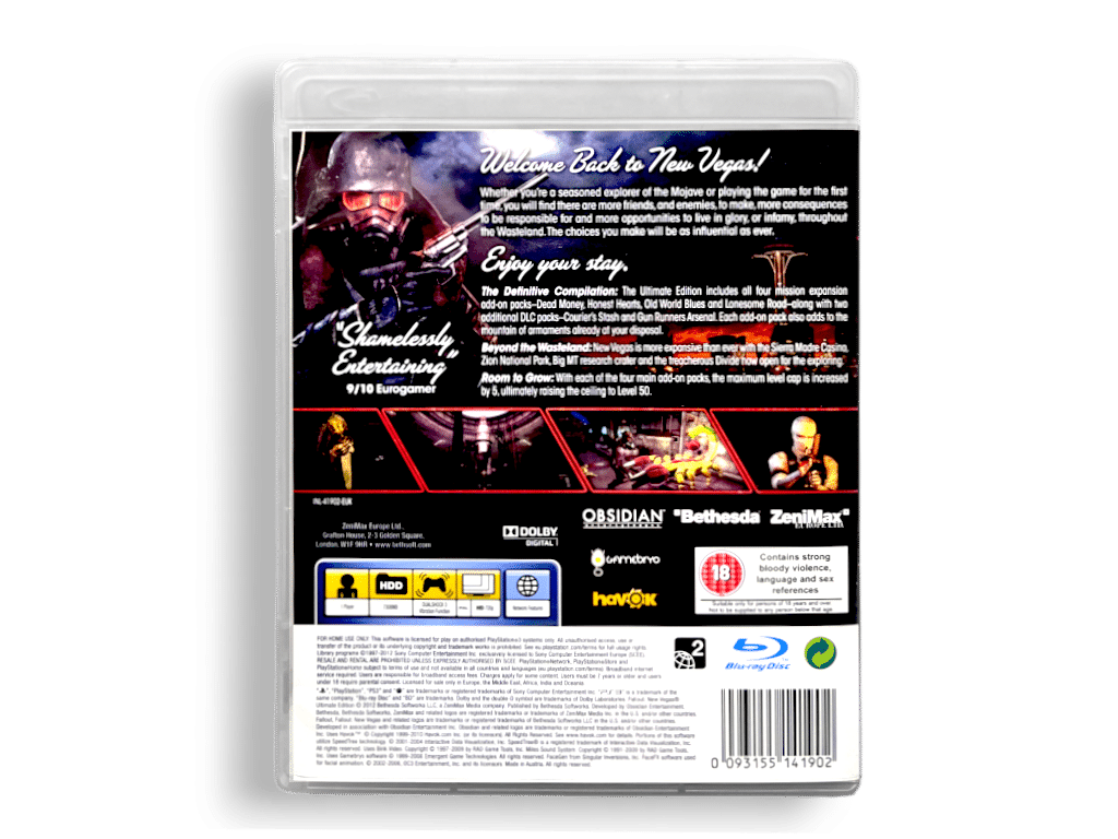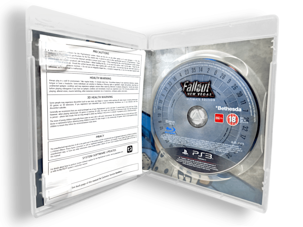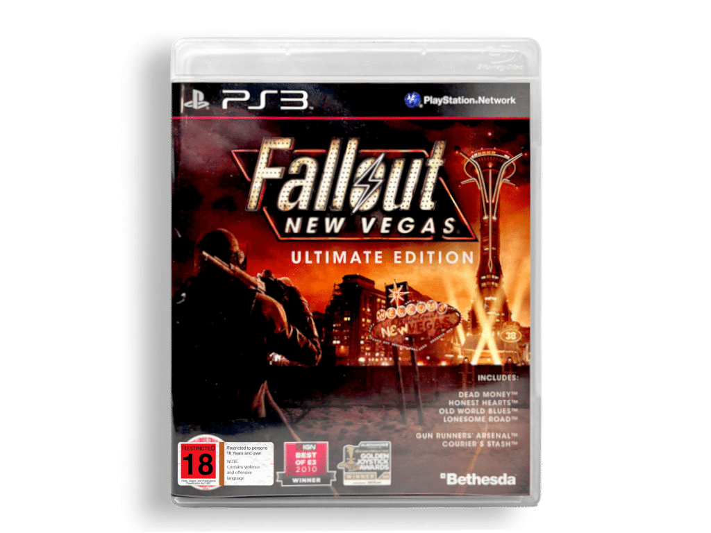 RARE FIND: AUTHENTIC REVERSIBLE COVER ORIGINAL PRINT in Mint Condition & 100% Complete with Contents: FALLOUT NEW VEGAS ULTIMATE EDITION / Fall Out New Vegas ULTIMATE EDITION for SONY PlayStation 3 / PS3. This preowned game is in Pristine Condition – and comes complete with case, cover, carded insert, and game disc. A tidy and complete collector’s item.