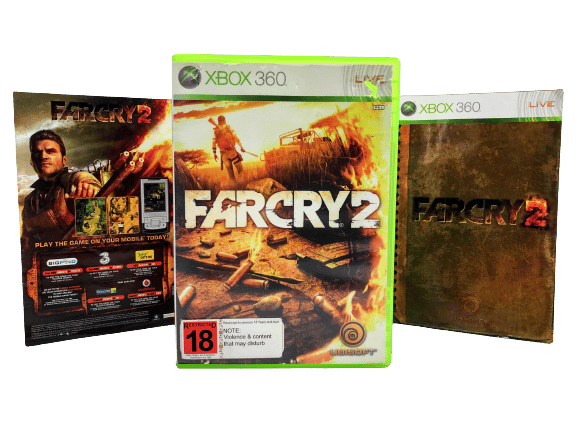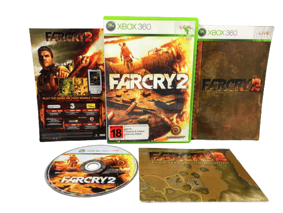The Original Print in Excellent Condition and complete with BOTH manual AND poster / map: FAR CRY 2 for Xbox 360. This preowned game is in superb condition and includes case + cover + manual / booklet, poster, and game disc. Promo card not included. Overall, a tidy and complete collector’s item.