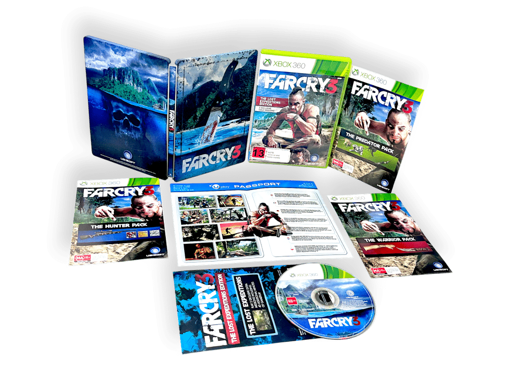 This preowned GENUINE LIMITED STEEL CASE COLLECTOR’S EDITION is in very good condition as pictured. Includes each of the Steel Case + Game Case + Cover + Game Disc + pictured promo cards and voucher cards / paperwork (all voucher codes have long since expired, but these were promotional only and are not required for gameplay or completion). The full Far Cry 3 game is included on the game disc, which has some mild markings and superficial scratches only wich do not affect gamaeplay or performance in any way. This Limited Release Steelbook is sleek and striking in appearance, with bold colours. There is a shallow indentation and some minor aging spots on the steel finish as pictured, but these do not detract from the overall presentation of this rare collectuible. Refer photographs.