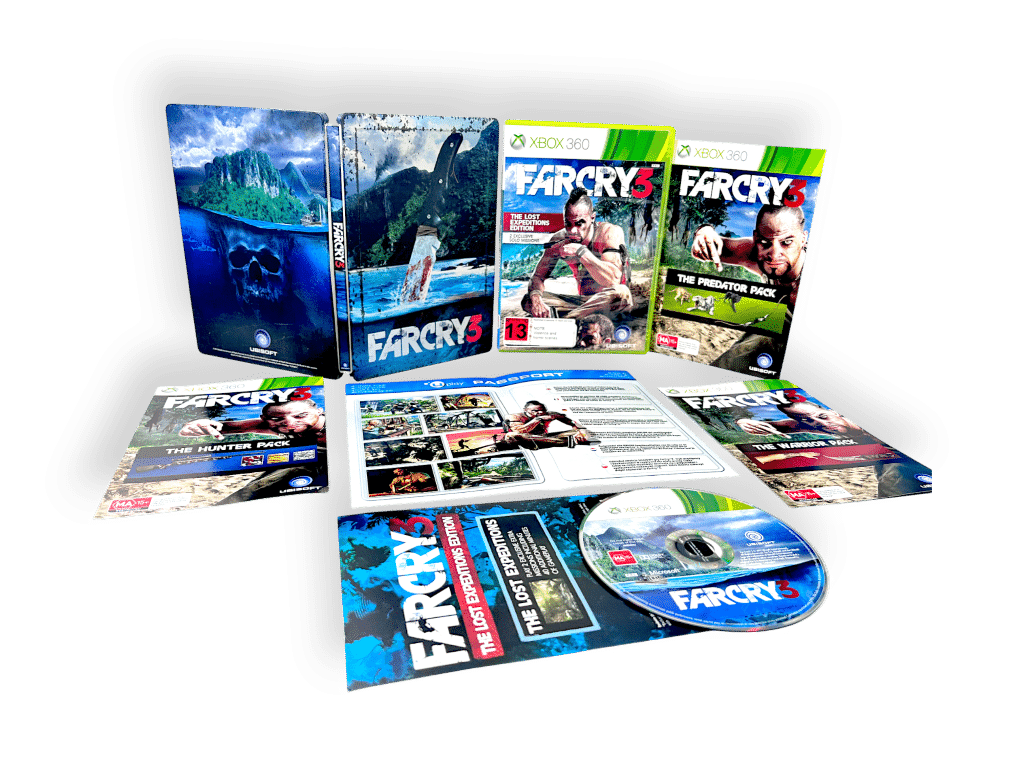 This preowned GENUINE LIMITED STEEL CASE COLLECTOR’S EDITION is in very good condition as pictured. Includes each of the Steel Case + Game Case + Cover + Game Disc + pictured promo cards and voucher cards / paperwork (all voucher codes have long since expired, but these were promotional only and are not required for gameplay or completion). The full Far Cry 3 game is included on the game disc, which has some mild markings and superficial scratches only wich do not affect gamaeplay or performance in any way. This Limited Release Steelbook is sleek and striking in appearance, with bold colours. There is a shallow indentation and some minor aging spots on the steel finish as pictured, but these do not detract from the overall presentation of this rare collectuible. Refer photographs.