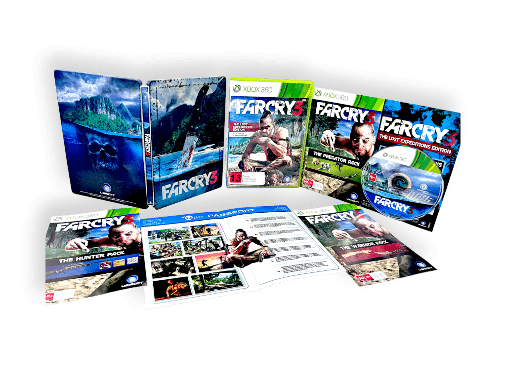 This preowned GENUINE LIMITED STEEL CASE COLLECTOR’S EDITION is in very good condition as pictured. Includes each of the Steel Case + Game Case + Cover + Game Disc + pictured promo cards and voucher cards / paperwork (all voucher codes have long since expired, but these were promotional only and are not required for gameplay or completion). The full Far Cry 3 game is included on the game disc, which has some mild markings and superficial scratches only wich do not affect gamaeplay or performance in any way. This Limited Release Steelbook is sleek and striking in appearance, with bold colours. There is a shallow indentation and some minor aging spots on the steel finish as pictured, but these do not detract from the overall presentation of this rare collectuible. Refer photographs.