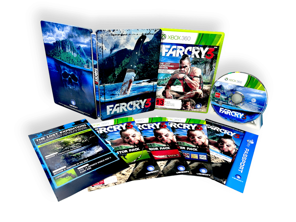 This preowned GENUINE LIMITED STEEL CASE COLLECTOR’S EDITION is in very good condition as pictured. Includes each of the Steel Case + Game Case + Cover + Game Disc + pictured promo cards and voucher cards / paperwork (all voucher codes have long since expired, but these were promotional only and are not required for gameplay or completion). The full Far Cry 3 game is included on the game disc, which has some mild markings and superficial scratches only wich do not affect gamaeplay or performance in any way. This Limited Release Steelbook is sleek and striking in appearance, with bold colours. There is a shallow indentation and some minor aging spots on the steel finish as pictured, but these do not detract from the overall presentation of this rare collectuible. Refer photographs.