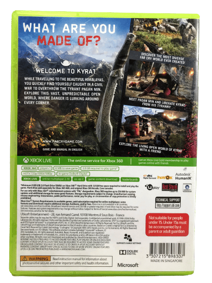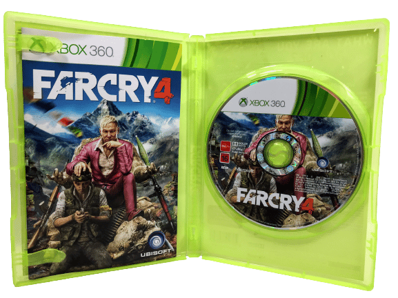 FAR CRY 4 / FarCry 4 for Xbox 360. This preowned game disc is in Excellent condition and comes with case + cover + manual and inserts. Case has some mild plastic laminate wear, but this is purely cosmetic, and the game disc inside is pristine.