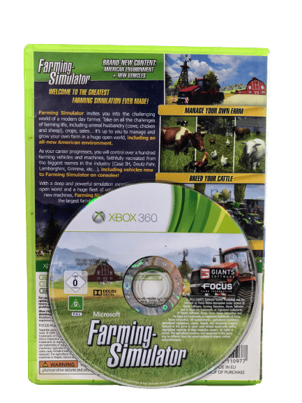 Rare XBox 360 Game: FARMING SIMULATOR / Farming Simulator 13. This preowned game is in excellent condition, with case, cover, and game disc. No manual included, but the game is self-explanatory, and the instructions are readily available online.