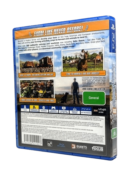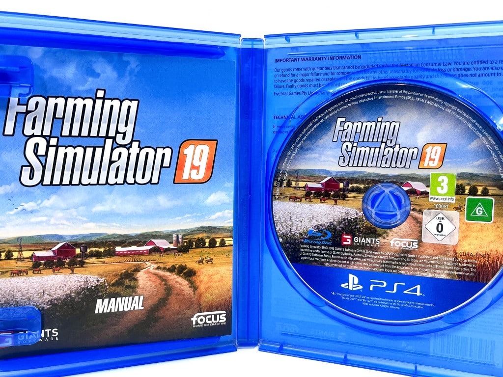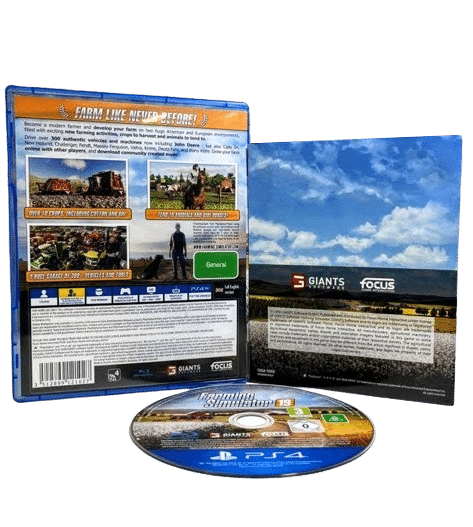 RARE PS4 Game in the even scarcer Official NZ Print – in Mint Condition & 100% Complete with Contents: FARMING SIMULATOR 19 / Farming Simulator ’19 for SONY PlayStation 4 / PS4. This preowned game comes complete with case + authentic New Zealand cover (with the signature “G” Classification embedded in the cover art and on the game disc) + manual / booklet + carded inserts + game disc. A tidy and complete collector’s item.