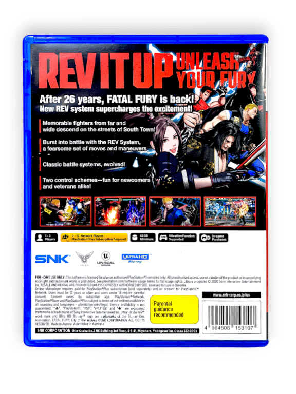 Description: SNK’s legendary fighting series returns with Fatal Fury: City of the Wolves. Featuring new mechanics, high-definition visuals, and fan-favourite fighters like Terry Bogard, this PS5 edition includes Season Pass 1 and bonus DLC costume packs for the ultimate fighting experience.
