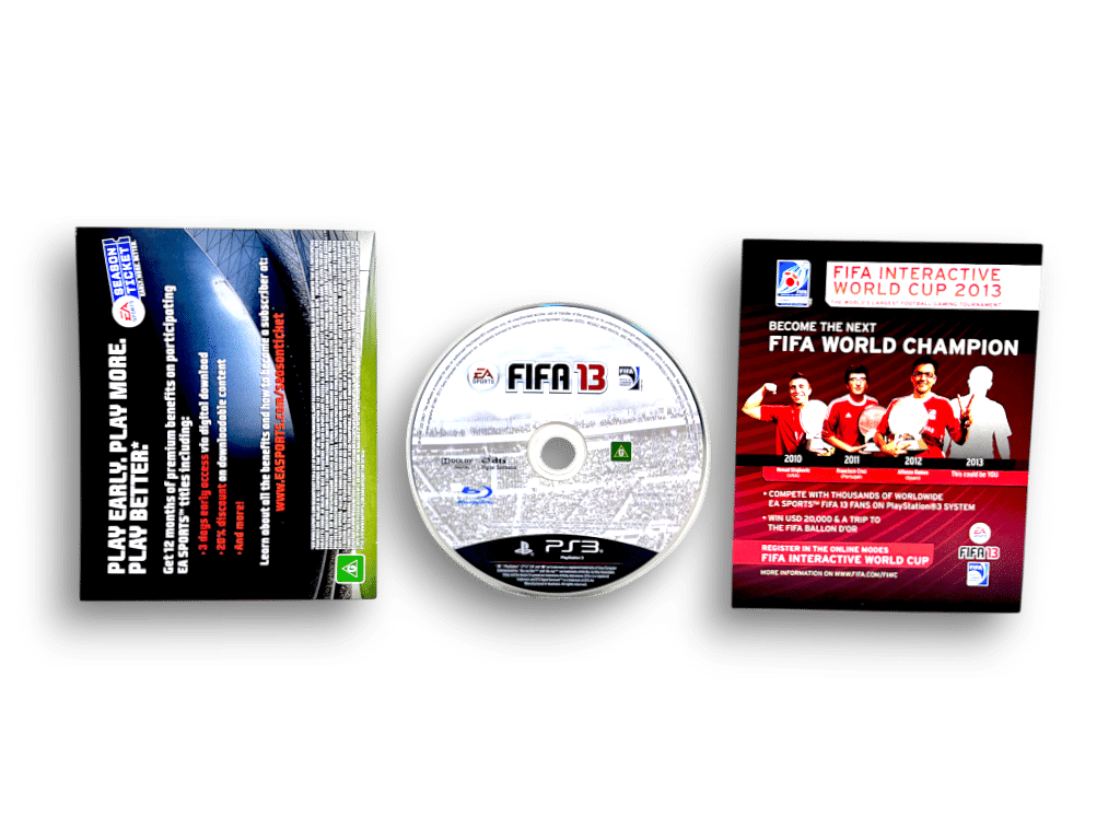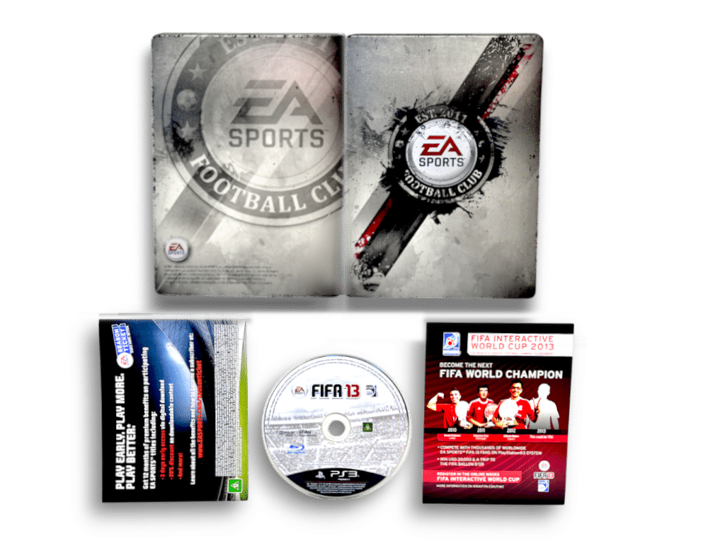EA SPORTS FIFA 13 STEEL CASE COLLECTOR’S EDITION for SONY PlayStation 3 / PS3. This preowned authentic Limited Release Steelbook Edition is in good condition as pictured. This Special STEEL CASE COLLECTOR’S EDITION includes pictured contents. An old $24 price sticker is on the steelbook (not pictured), but this price sticker can be removed with care. A rare collectible to be added to any serious collector’s library.