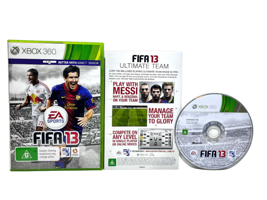 FIFA ’13 for XBox 360. This preowned game is in Excellent condition and includes case + cover + game disc.