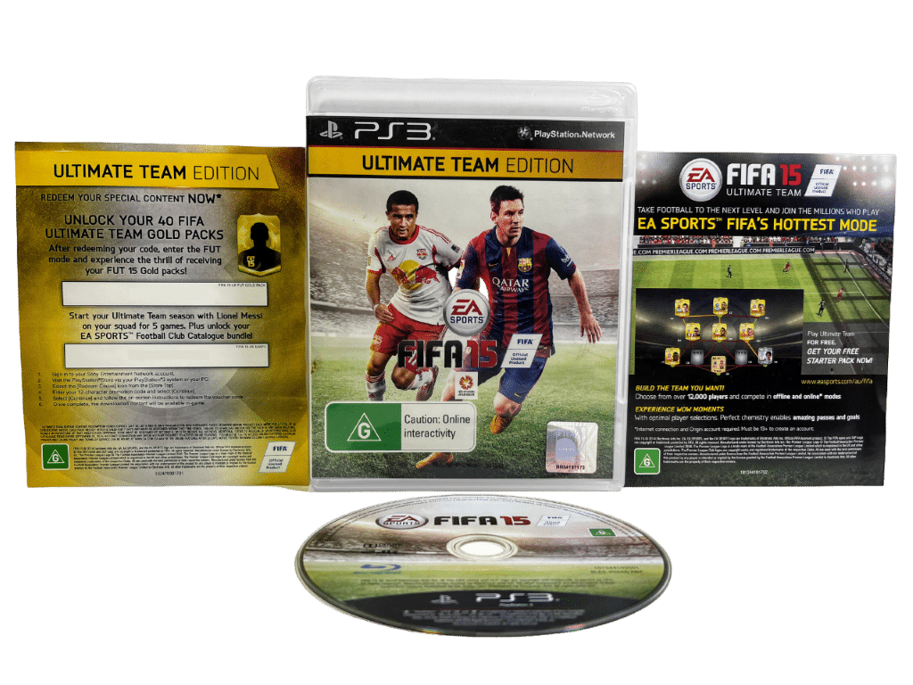 Excellent condition & 100% complete with contents: FIFA 15 for SONY PlayStation 3 / PS3. This preowned game comes complete with case, Authentic ULTIMATE EDITION cover, manual / booklet, and game disc. Any single use paper vouchers will have expired. The full FIFA 15 game is included on the disc.