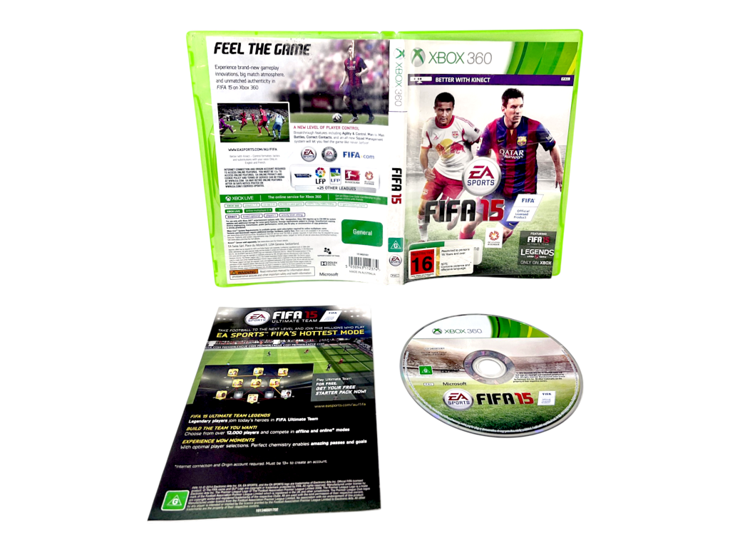 DESCRIPTION: FIFA 15 on Xbox 360 delivers realistic football gameplay with improved player emotions and presentation. Featuring licensed teams and leagues, it offers multiple modes including career and online play. This complete copy includes case, disc, and insert. Popular among sports gamers.