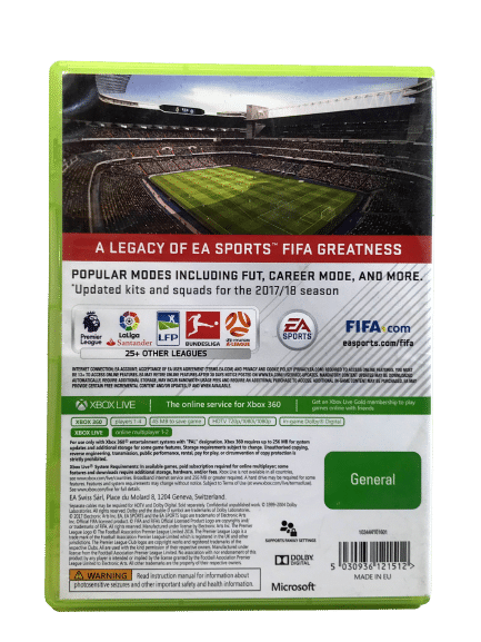 RARE XBox 360 Edition in excellent condition & 100% complete with contents: FIFA 18 / Fifa 2K18, Fifa 2018 for Xbox 360. This preowned game is in superb condition with only faint scratches, and complete with case, cover, manual / booklet, carded inserts – each in excellent condition. Overall, a tidy and complete collector’s item, which would be near-mint with a disc resurface. A rare game which is hard game to find on Xbox 360!