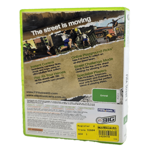 Excellent condition & 100% complete with contents: FIFA Street 3 for XBox 360. This preowned game comes complete with cover, manual / booklet, and game disc each in Mint Condition.