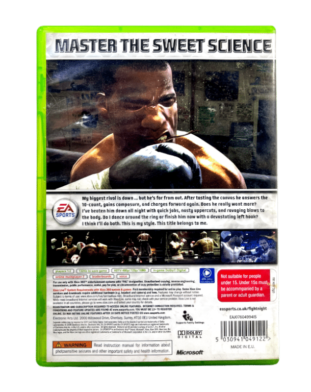 EA Sports presents FIGHT NIGHT ROUND 3 for Xbox 360. This preowned game is in good condition with light scratches only which do not affect game play. Comes complete with manual. Front cover of manual has a white sticker on it as pictured.