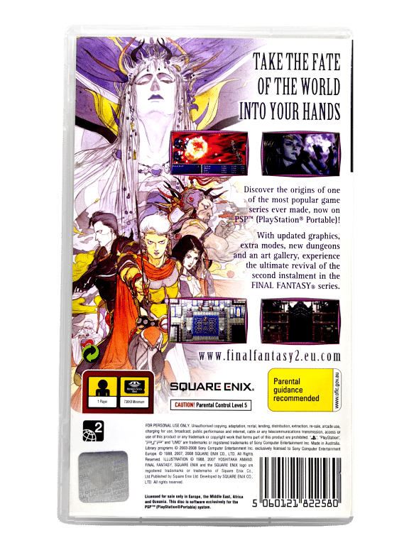 Originally released in 1987 in Japan, FINAL FANTASY was hailed by gamers and critics alike as one of the first RPGs to create a fantasy world that captured the imagination of players around the globe. Twenty years later, the illustrious FINAL FANTASY franchise comes full circle: remastered as two separate titles exclusively for the PSP® system, FINAL FANTASY and FINAL FANTASY II are timeless classics that created the blueprints for the future of RPGs. These all-new 20th Anniversary editions are treated with crisp, updated graphics, an unforgettable enhanced soundtrack and a vibrant widescreen presentation.