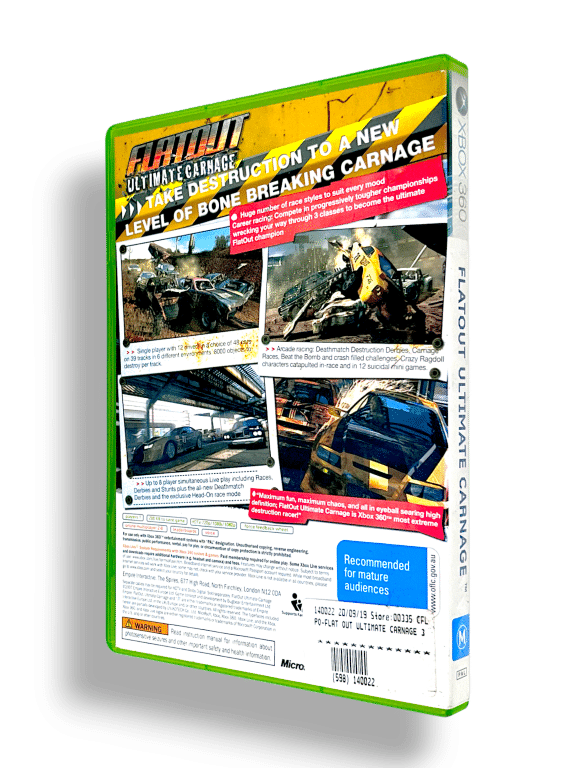 FlatOut Ultimate Carnage is a high-octane racing game for the Xbox 360 that puts a heavy emphasis on destruction and mayhem. It combines traditional circuit racing with demolition derby-style combat, where crashing into opponents and smashing through the environment is not only encouraged but often required to win. The game features advanced physics that cause severe car damage and spectacular crashes, often sending the ragdoll driver flying through the windshield in a variety of hilarious stunt challenges.