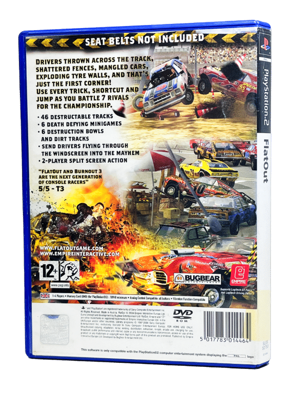 FLATOUT / FLAT OUT The Original Game for SONY PlayStation 2 / ps2. This preowned game is in good condition and includes pictured case + cover + game disc. Faint scratches, but these extremely minor. Disc is in good condition and plays perfectly.