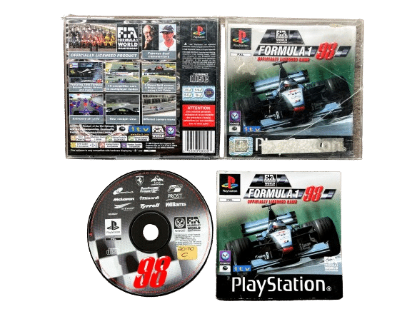 Good condition & 100% complete with contents: FORMULA 1 ’98 / FORMULA ONE 98 / FORMULA 1 1998 / F1 98 for SONY PlayStation 1 / PS1. This preowned game comes complete with case, cover, manual / booklet, and game disc. Front plastic panel has some plastic cracks, and the disc some light superficial markings / cosmetic scratches, but these are very minor imperfections which do not affect game play in any way.