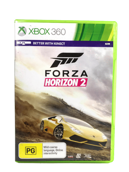 FORZA HORIZON 2 for Xbox 360. This preowned game is in good condition with mild markings and faint scratches only, and comes complete with case, cover, and game disc. Advertising card not included.
