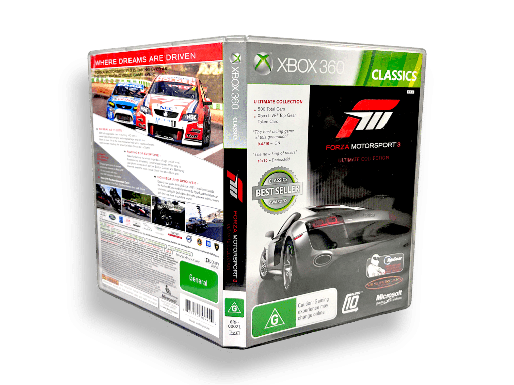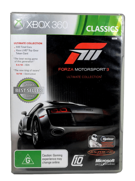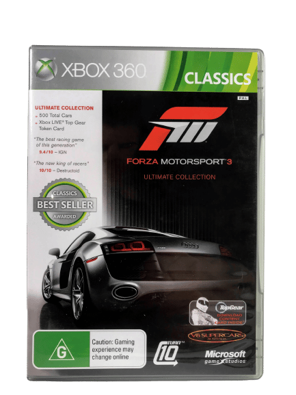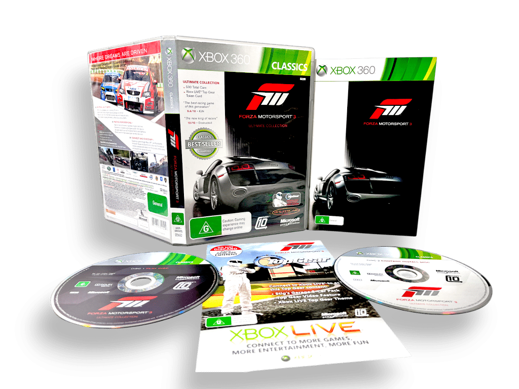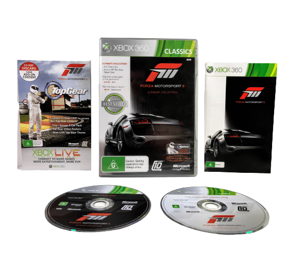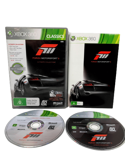 RARE Limited ULTIMATE COLLECTION Edition in Excellent Condition & Complete with Manual / Booklet and INCLUDING AUTHENTIC “ULTIMATE COLLECTION” Discs: Forza Motorsport 3 the ULTIMATE COLLECTION for Xbox 360. Both of these two games discs are in Mint Condition, and this game comes complete with case + cover + manual / booklet + promo card + 2 X Official Ultimate Collection game discs with the BONUS ULTIMATE COLLECTION CONTENT INCLUDED ON THE DISCS.