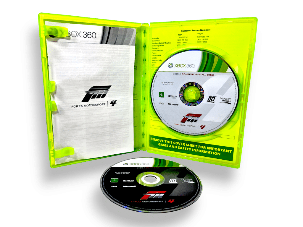 Excellent condition & 100% complete with contents: FORZA MOTORSPORT 4 for Xbox 360. This preowned game is in superb condition with only faint disc surface imperfections, and comes complete with pictured case + cover + manual / booklet +2 x game discs.