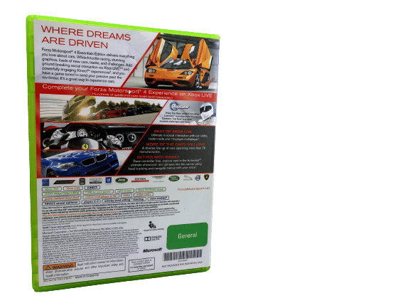 FORZA MOTORSPORT 4 Essentials Edition for Xbox 360. This preowned game is in good condition and includes case + cover + instruction card + game disc. Some light markings on the disc, but these are very minor cosmetic imperfections only which do not affect game play in any way. Please note that the manual is not included in this listing, but the game is self-explanatory, and the instructions are readily available online.