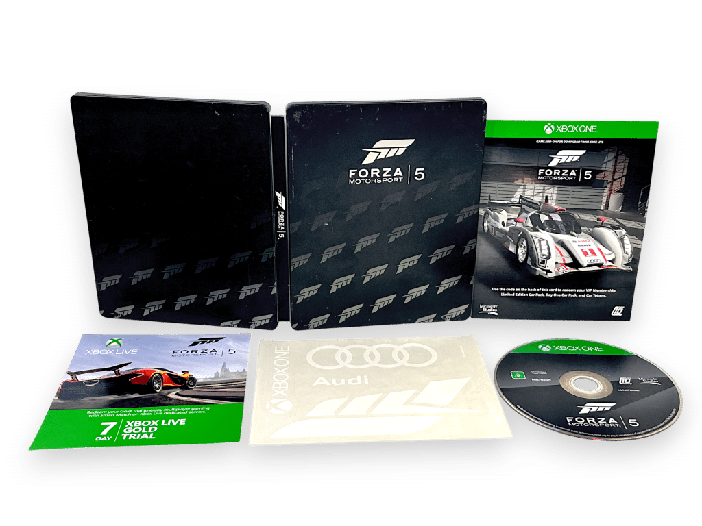 GENUINE LIMITED RELEASE STEEL CASE COLLECTOR’S EDITION with internal contents in Excellent Condition and BRAND NEW STICKER SHEET: Forza Motorsport 5: Limited Edition SteelBook (Xbox One). This preowned official Limited Release Steel Case Collector’s Edition featuires internal contents and game disc each in excellent condition, Sticker Sheet still NEW & UNPEELED, and the Steelbook also good with some expected minor surface imperfections on the steel finish consistent with shelf life. Overall, a lovely Limited Release Forza item. Refer photographs.