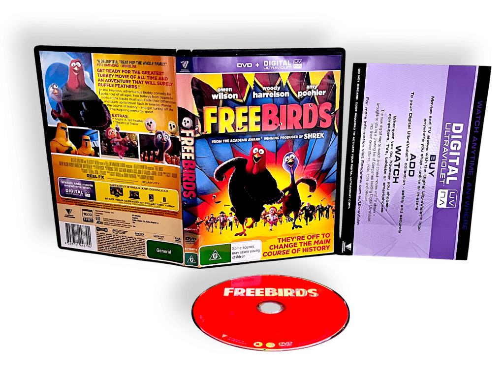 Free Birds (DVD). This pre-owned DVD movie is in good condition and complete with original case, mild markings and faint scratches on disc. But these are purely cosmetic and do not hinder performance or play in the slightest.