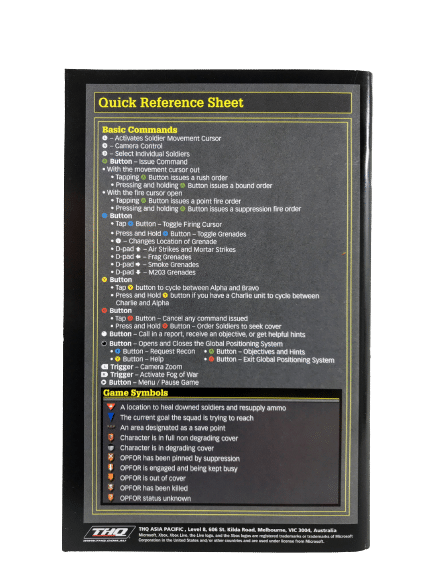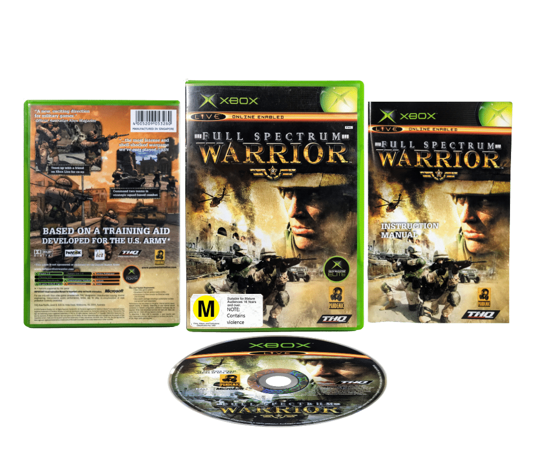 Good condition & 100% Complete with Contents: FULL SPECTRUM WARRIOR for Original XBox. This preowned game comes complete with cover, manual / booklet, and game disc – each in excellent condition. Case has a small plastic chip along the bottom edge, but this is a minor imperfection which does not hinder its functionality in any way, and all internal contents are in superb condition.