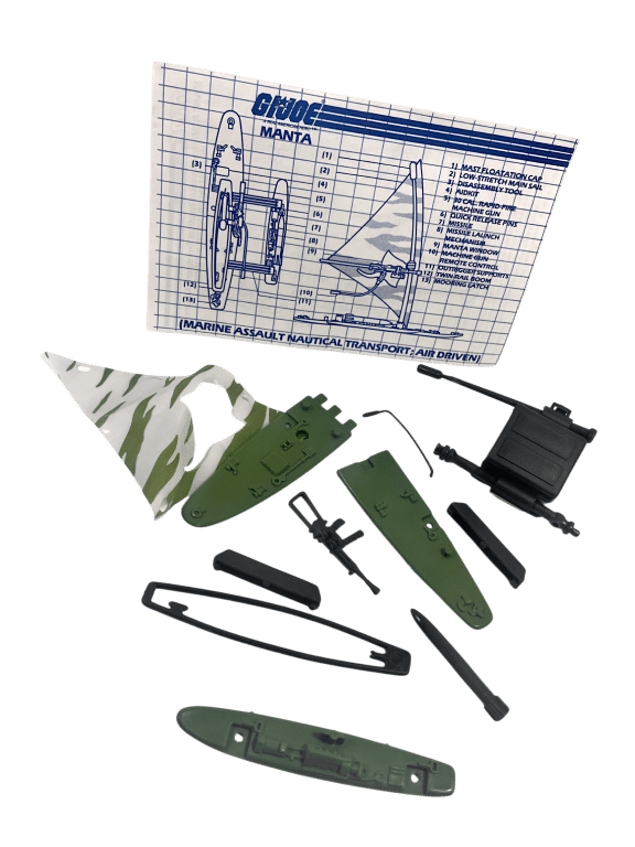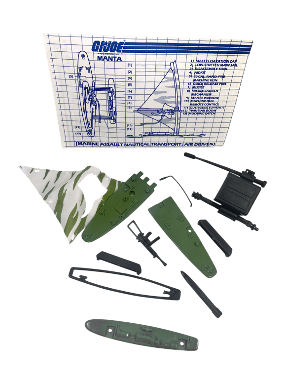 Rare find: excellent condition & 100% complete with contents: G.I. Joe M.A.N.T.A. GI Joe (1984 – GENUINE). Authentic 1984 GIJoe MANTA Vehicle. Excellent condition with all pictured accessories + instructions included. This was a mailaway order that WAS available here in New Zealand, along with the parachute pack and Hooded Cobra Commander in 1989. This was the only exclusive mail order GI Joe promotion that New Zealand received to my knowledge. The Hooded Cobra Commander and Parachute pack are sold separately. This listing is for the G.I.Joe M.A.N.T.A. only. Refer images.