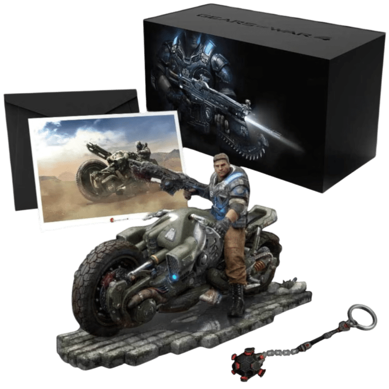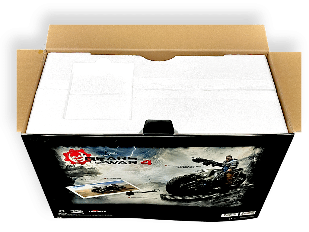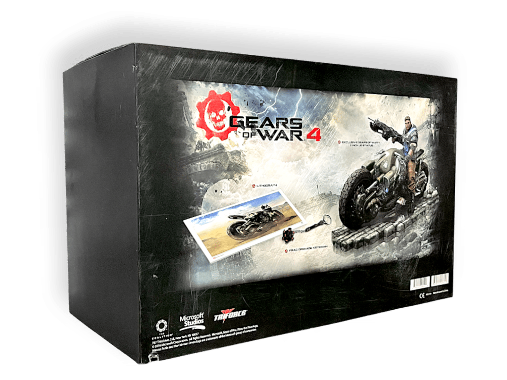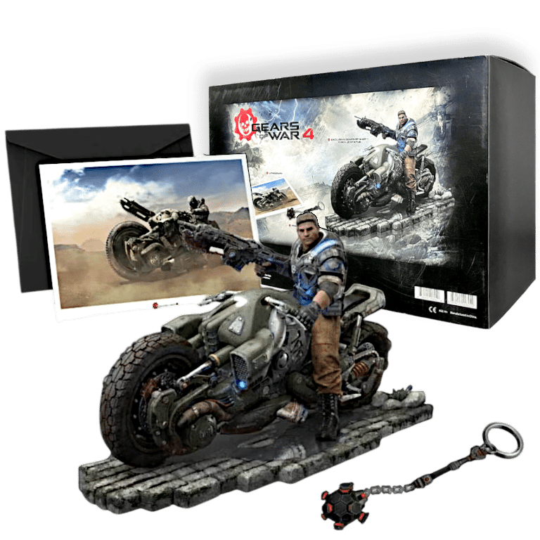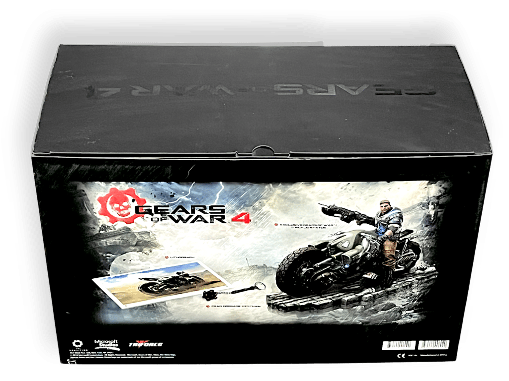 Gears of War 4 – Collector’s Edition (Xbox One). HUGE Collector’s Boxed Edition in Excellent Condition and Complete with Inner Contents. This preowned ENORMOUS BOXED COLLECTOR’S BUNDLE contains some of the rarer Gears of War collectibles inside – each in mint condition, and the outer box excellent with only mild shelf wear.