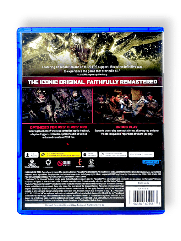 Gears of War Reloaded for SONY PlayStation 5 / PS5. This preowned game is in excellent condition and complete with original case, cover, and game disc.