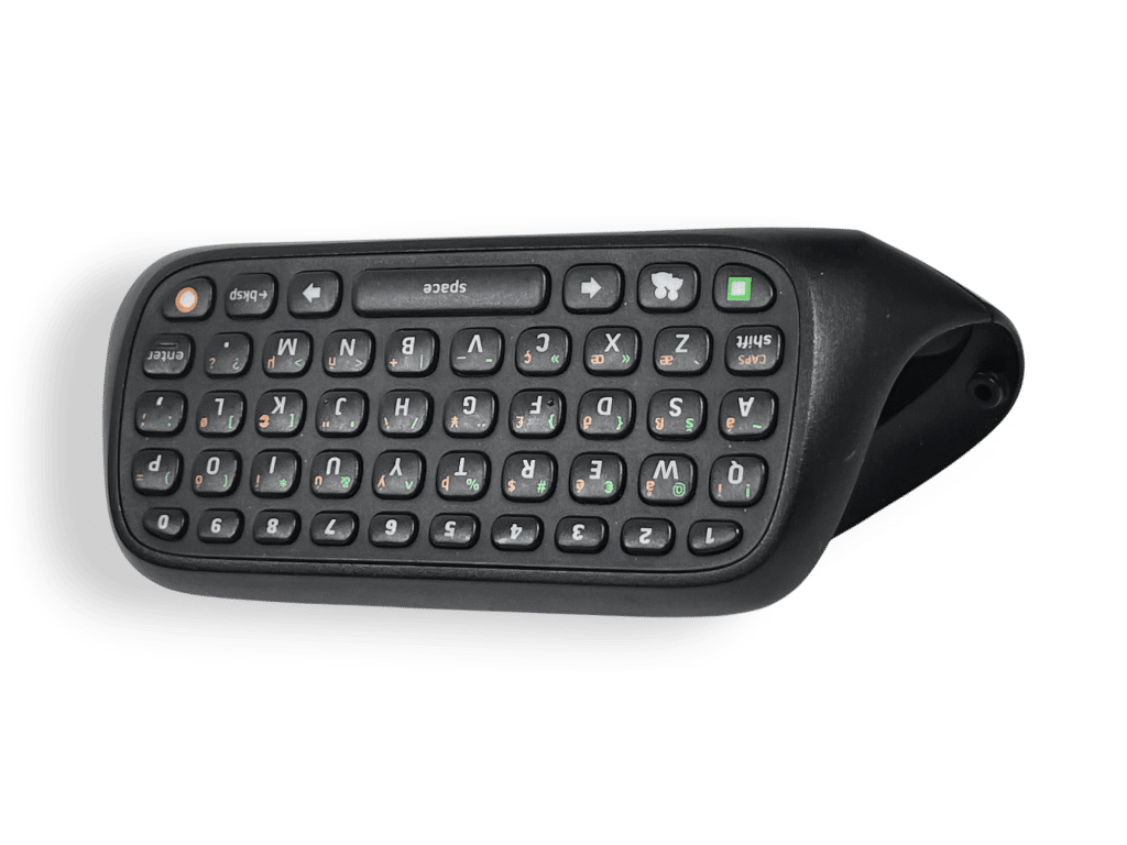 Clip-on mini QWERTY keyboard for Xbox 360 controllers. Ideal for messaging, code entry, and fast text input during gameplay. Snaps directly onto controller.