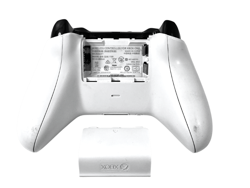 Genuine Microsoft Wireless Xbox One Controller in good condition. Includes authentic battery hatch. Takes 2 x AA batteries (batteries not included). Rubber worn off one of the analogs, but this is a purely cosmetic imperfection which does not inhibit performance or functionality in any way. Refer photographs.