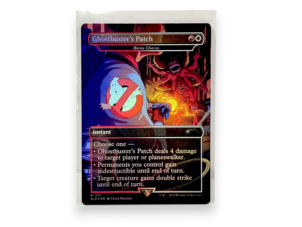A versatile modal instant offering burn, indestructibility, or double strike—excellent utility for aggressive or midrange Boros strategies. Its flexibility makes it great in Commander where adaptable answers matter. The Ghostbusters Secret Lair art adds bold thematic flair to a reliable combat trick.